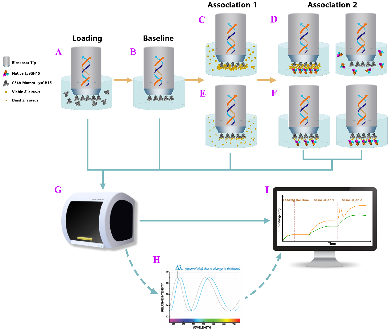 金黄色葡萄球菌是重要的人兽共患病原菌,同时还是重要的食源性病原菌,给人类健康和养殖业带来了巨大的威胁。实现对该病原菌的快速检测是防控该病原造成重大危害的关键。目前已有多种检测方法建立,包括经典的培养法、PCR方法、ELISA等方法,但这些方法都存在有待解决的问题。噬菌体裂解酶可以特异性的识别并裂解特定的细菌,因此在检测和防控病原菌方法具有巨大的潜力。本课题组前期筛选获得了对金黄色葡萄球菌具有特异性杀菌活性的噬菌体裂解酶(J Clin Microbiol. 2011 Jan;49(1):111-7.),成功解析了其三维结构,揭示了其识别和裂解金葡菌的作用机制(PLoS Pathog. 2014 May 15;10(5):e1004109.)。在此基础上,本课题组通过催化位点突变失活了其裂解活性而保留了其特异性结合金葡菌的能力,可作为金葡菌的检测元件。而BLI技术具有无标记、灵敏、实时等特点,因此我们将失活裂解酶与BLI技术进行了结合建立了快速、特异、灵敏的金葡菌检测新方法,并且通过将native裂解酶巧妙的用于检测样品的二次处理,实现了能够确定样品中所含金葡菌的死活状态。