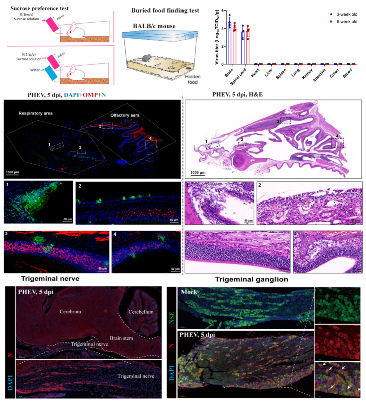 该研究成果报道了PHEV经呼吸道感染后导致嗅觉及味觉功能障碍;病毒在鼻黏膜复制后沿嗅神经及三叉神经侵入中枢神经系统引起神经损伤。研究结果不仅有利于扩展PHEV感染与神经损伤相关的基础理论,为临床上猪血凝性脑脊髓炎的综合防控提供参考,而且可将PHEV作为一种模式病毒,开展呼吸道感染冠状病毒所致嗅觉味觉损伤及神经功能障碍的机制研究,具有一定的科学意义。