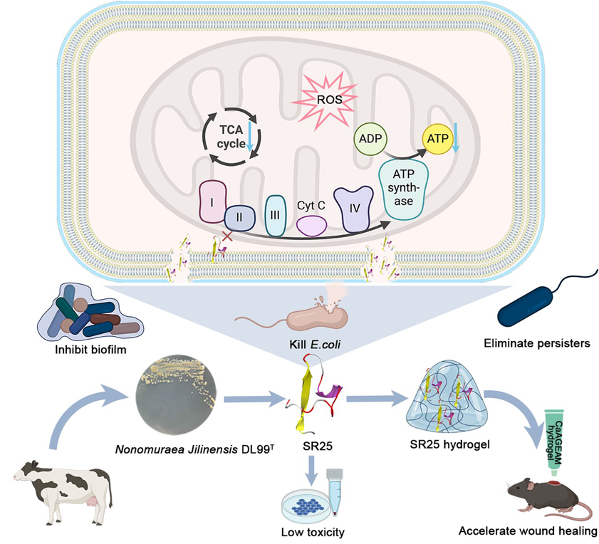2024年6月14日,tyc122ccvip杨勇军教授团队在学术期刊《Advanced Science》上发表,题为“Dual-mechanism Peptide SR25 has Broad Antimicrobial Activity and Potential Application for Healing Bacteria-infected Diabetic Wounds”的研究论文。这项研究从奶牛肠道共生菌中发现了一株新的放线菌种,命名为吉林野野村放线菌(Nonomuraea Jilinensis DL99T),从其全基因组序列中挖掘并鉴定了一种抗菌肽SR25。该肽在高浓度下对哺乳动物细胞没有明显毒性,而在低摩尔浓度下,可以有效杀灭革兰氏阴性和革兰氏阳性致病菌,同时抑制生物被膜的形成并消除持留菌,并且没有可检测的耐药性产生。