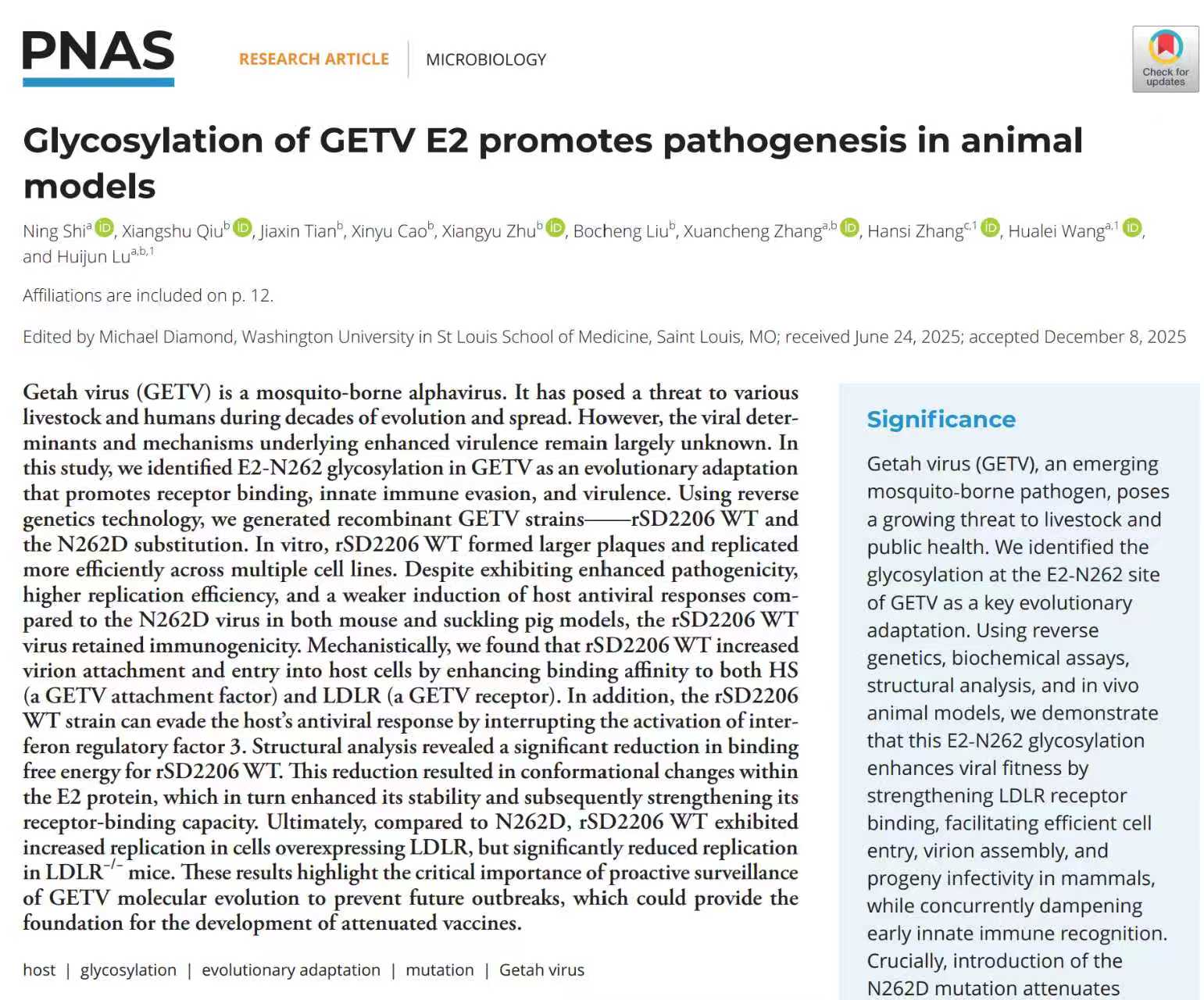 近期,tyc122ccvip/人畜共患传染病重症诊治全国重点实验室联合中国农业科学经理春兽医研究所在国际权威杂志《Proceedings of the National Academy of Sciences of the UnitedStates of America(PNAS)》上发表了题为《Glycosylation of GETV E2 promotes pathogenesis in animal models》的研究论文,在盖塔病毒致病机制研究领域取得重大突破。该研究系统揭示了GETV E2蛋白N262位糖基化修饰调控病毒致病性的分子机制,为该病毒的监测预警与防控技术研发提供了全新思路和科学依据。