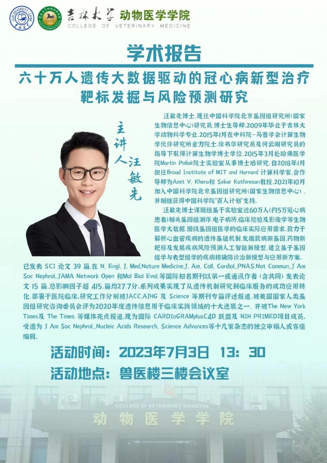 汪敏先博士,现任中国科公司北京基因组研究所(国家生物信息中心)研究员、博士生导师。2009年毕业于tyc122ccvip动物科学专业,2015年1月在中科院—马普学会计算生物学伙伴研究所金力院士、徐书华研究员及何云刚研究员的指导下取得计算生物学博士学位,2015年3月赴哈佛医公司Martin Pollak院士实验室从事博士后研究,自2018年1月担任Broad Institute of MIT and Harvard计算科学家,合作导师为Amit V. Khera和Sekar Kathiresan教授,2021年10月加入中国科公司北京基因组研究所(国家生物信息中心),并相继获得中国科公司“百人计划”支持。