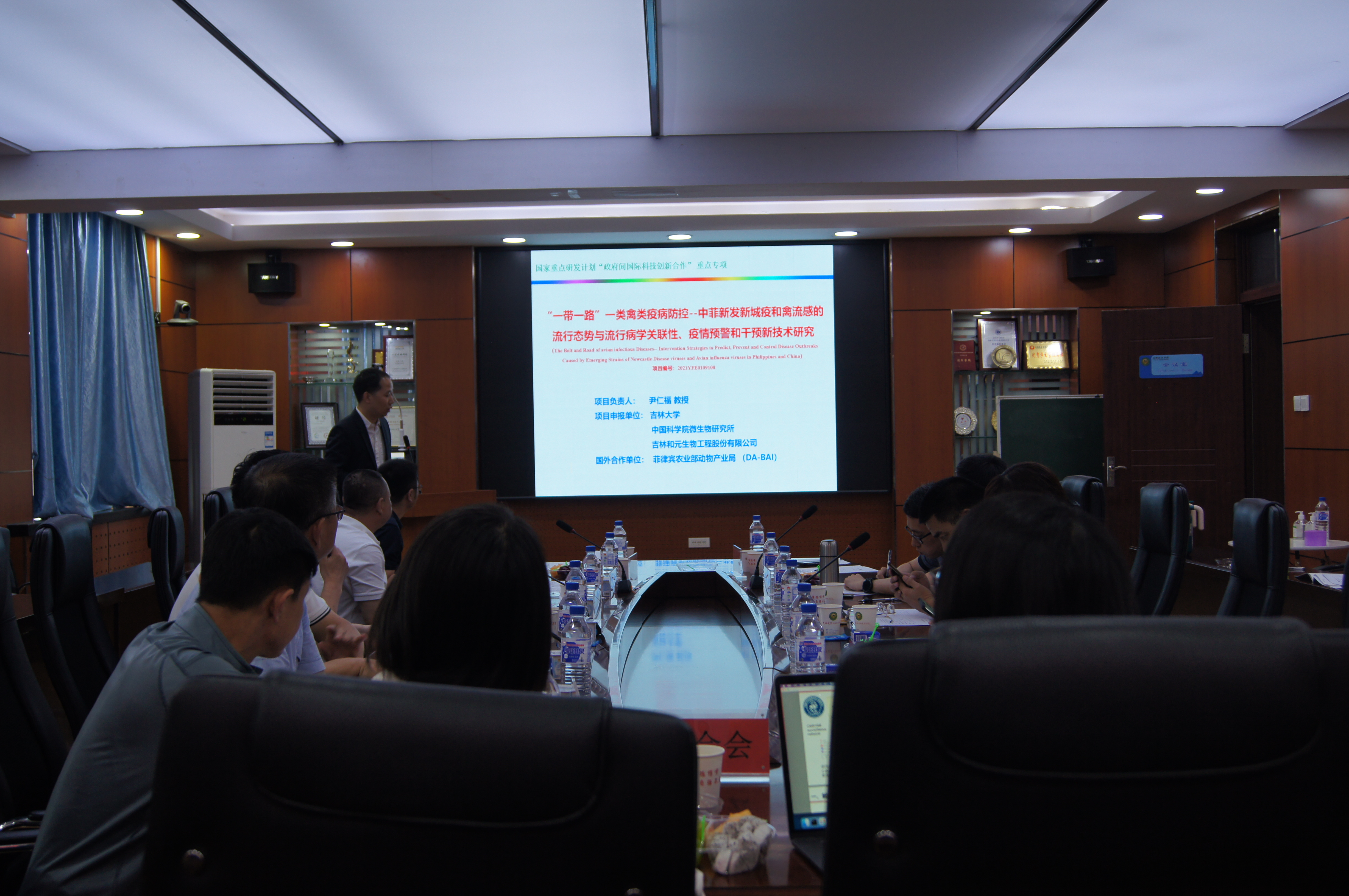 2021年6月25日,国家重点研发计划“政府间国际科技创新合作” 重点专项《“一带一路”一类禽类疫病防控--中菲新发新城疫和禽流感的流行态势与流行病学关联性、疫情预警和干预新技术研究》(项目编号:2021YFE0109100)在项目牵头单位tyc122ccvip正式启动,本项目由tyc122ccvip尹仁福教授牵头,联合中国科公司微生物研究所和吉林和元生物工程有限公司共同承担。吉林省科学技术厅国际合作处王冰副处长、tyc122ccvip科研院重大项目科张文超科长、项目咨询专家组、项目组成员及项目承担单位代表等二十余人参加了项目启动会。tyc122ccvip副经理王化磊教授和咨询专家组组长丁壮教授先后分别主持会议。