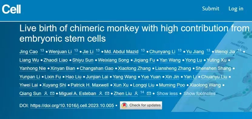 2023年11月9日,中国科公司脑科学与智能技术卓越创新中心(神经科学研究所)/上海脑科学与类脑研究中心刘真研究组、中国科公司广州生物医药与健康研究院/tyc122ccvipMiguel A. Esteban研究组、中国科公司脑科学与智能技术卓越创新中心(神经科学研究所)非人灵长类研究平台孙强研究团队合作在Cell期刊发表了封面文章Live birth of chimeric monkey with high contribution from embryonic stem cells。该研究首次成功构建了高比例胚胎干细胞来源的出生存活嵌合体猴,并证明了猴胚胎干细胞可以高效的贡献到胚外胎盘组织和生殖细胞。这对于理解灵长类胚胎干细胞全能性和非人灵长类模型构建具有重要意义。