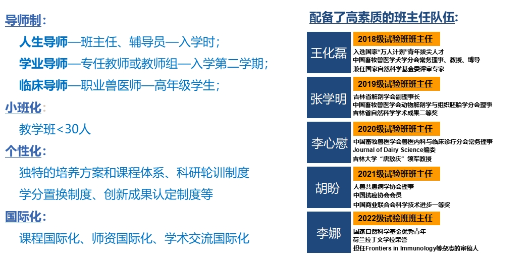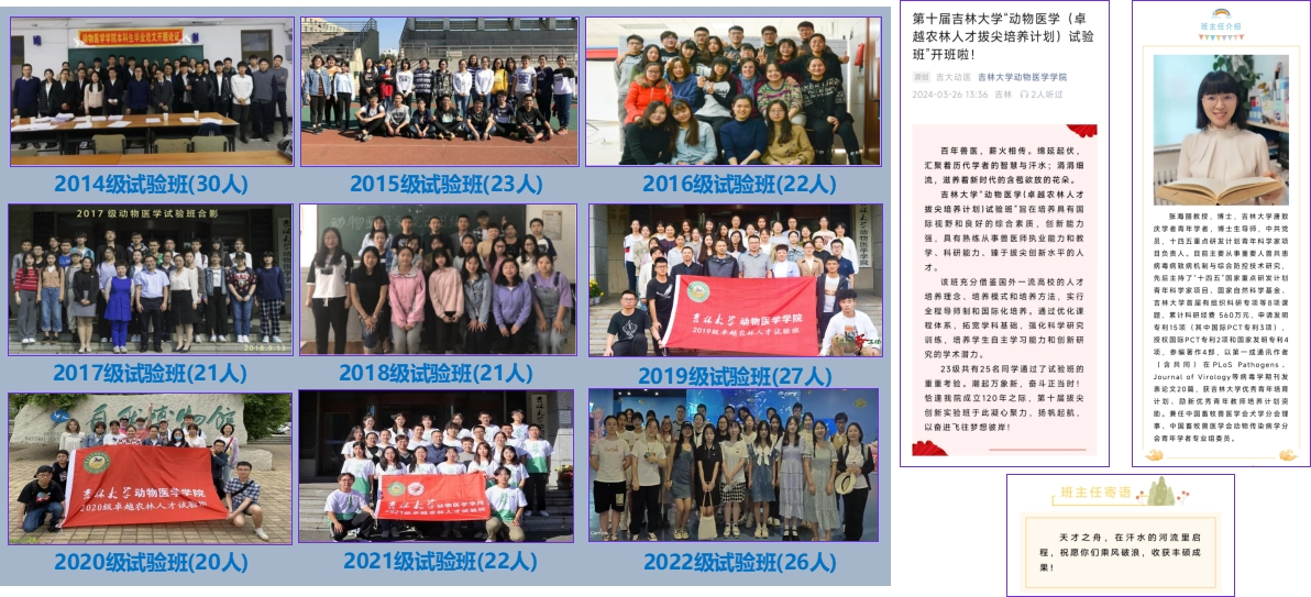 2014年试办卓越人才培养试验班,实行“一制三化”:导师制、小班化、个性化、国际化,现组建10期,累计237名员工,目前读研率为98%,出国交流率41%,科研参与率100%,发表SCI论文影响因子总数154.95,获国家级竞赛奖项59项。以2024届动物医学(卓越农林人才拔尖培养计划)试验班为例,班级27名员工,英语四六级通过率为100%,85%的同学被推免到清华、北大、中科院等双一流A类大学或科研院所,2人入选DVM项目,班级被评为“2023年tyc122ccvip十佳班级”。